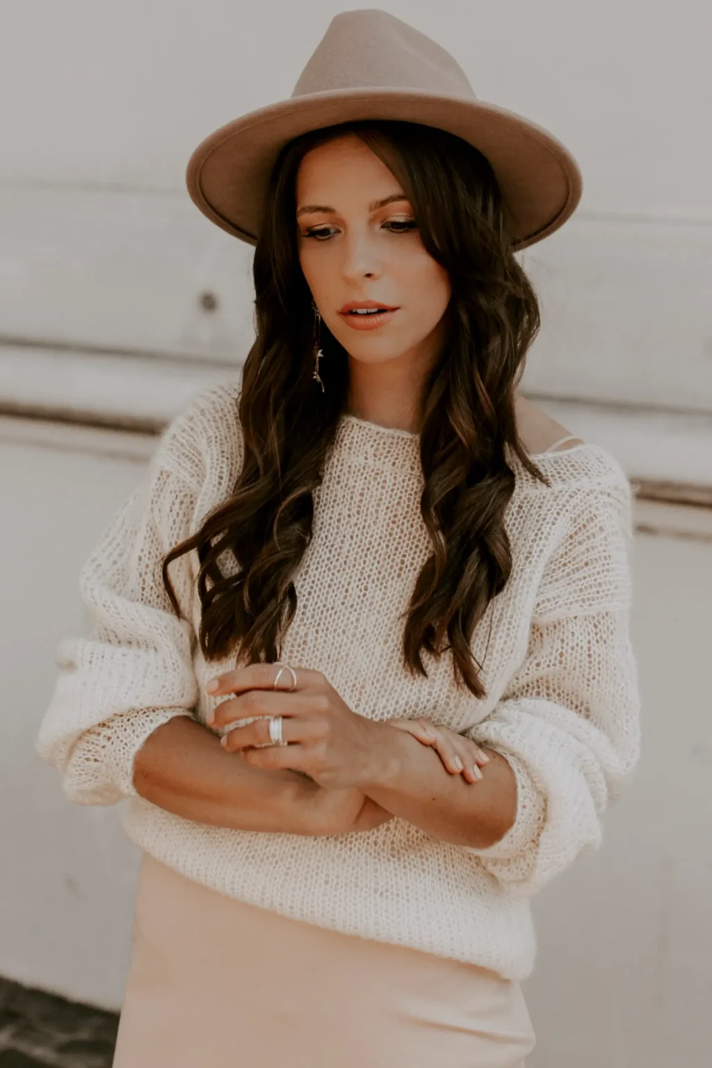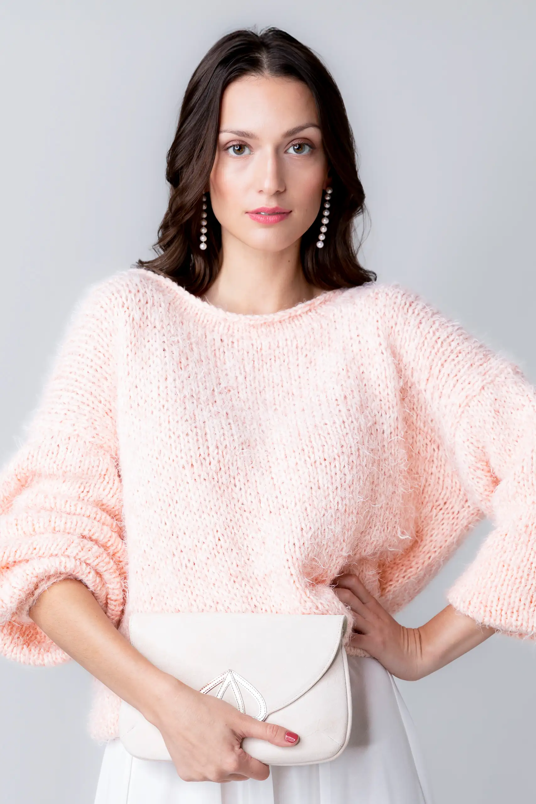 Handgestrickter, extra oversized Brautpullover aus flauschigem Garn mit tiefem V-Ausschnitt am Rücken, in glattem Strick mit langen Ballonärmeln. Lässiges als Oberteil zu Hosen und Röcken.