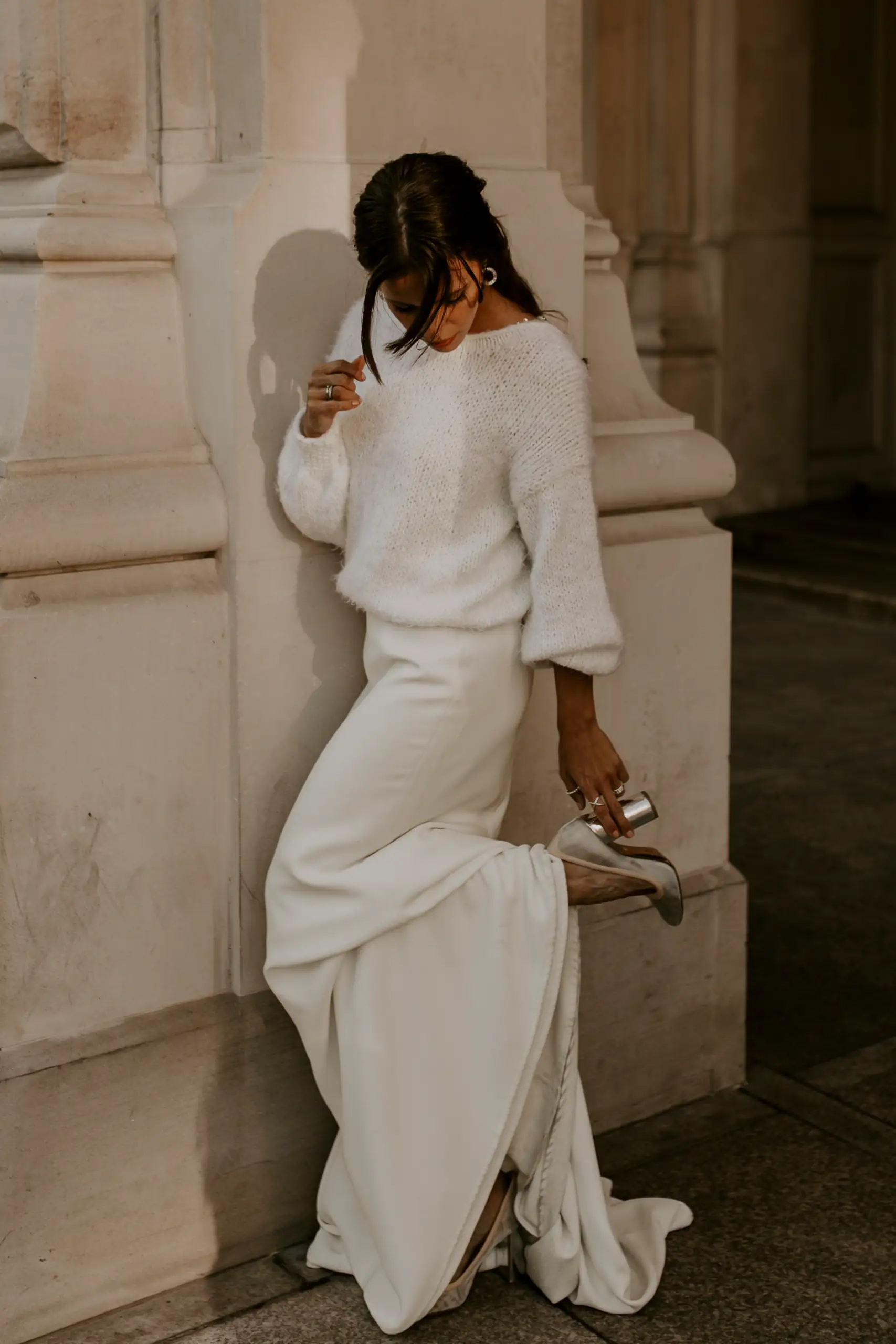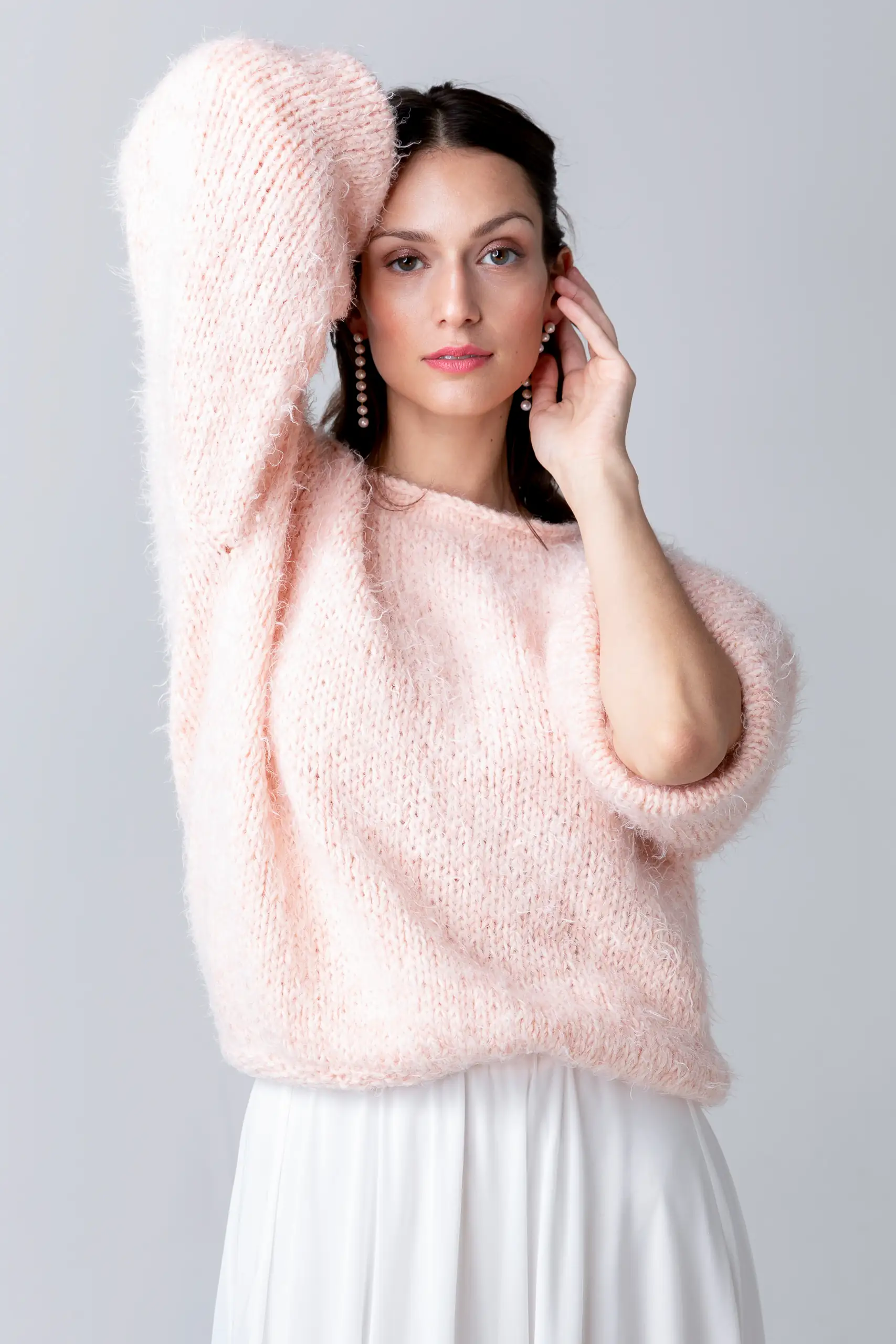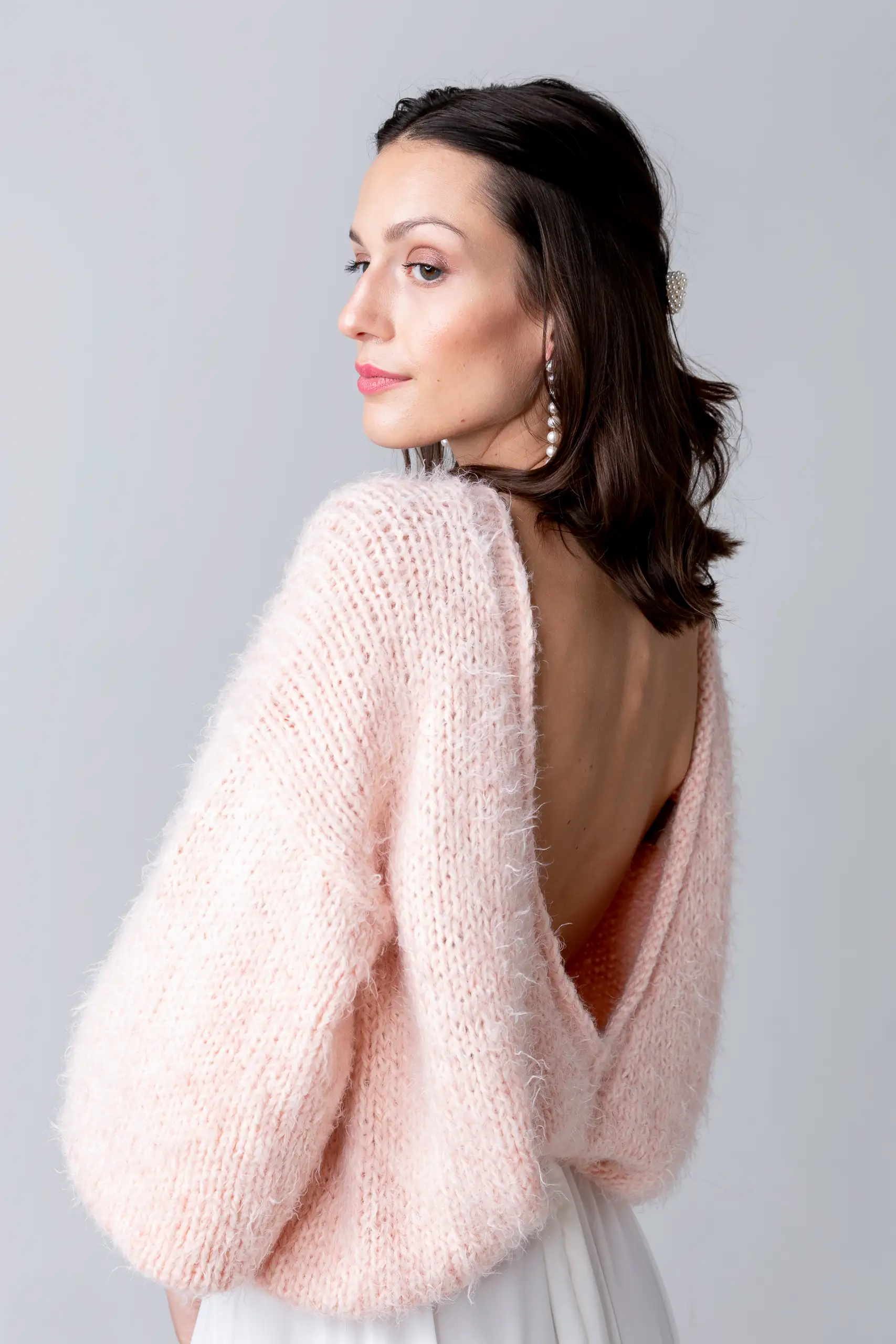 Handgestrickter, extra oversized Brautpullover aus flauschigem Garn mit tiefem V-Ausschnitt am Rücken, in glattem Strick mit langen Ballonärmeln. Lässiges als Oberteil zu Hosen und Röcken.