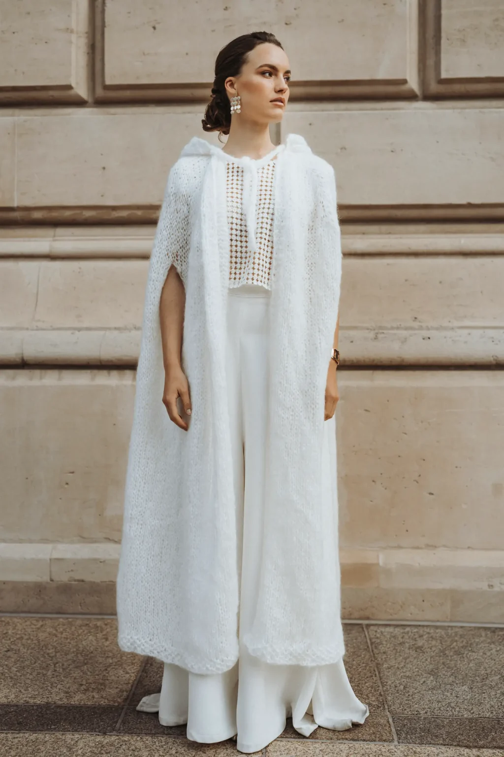 Flauschiger, kurzer, handgestrickter Braut-Poncho mit eleganter Kapuze und Bindekordel.