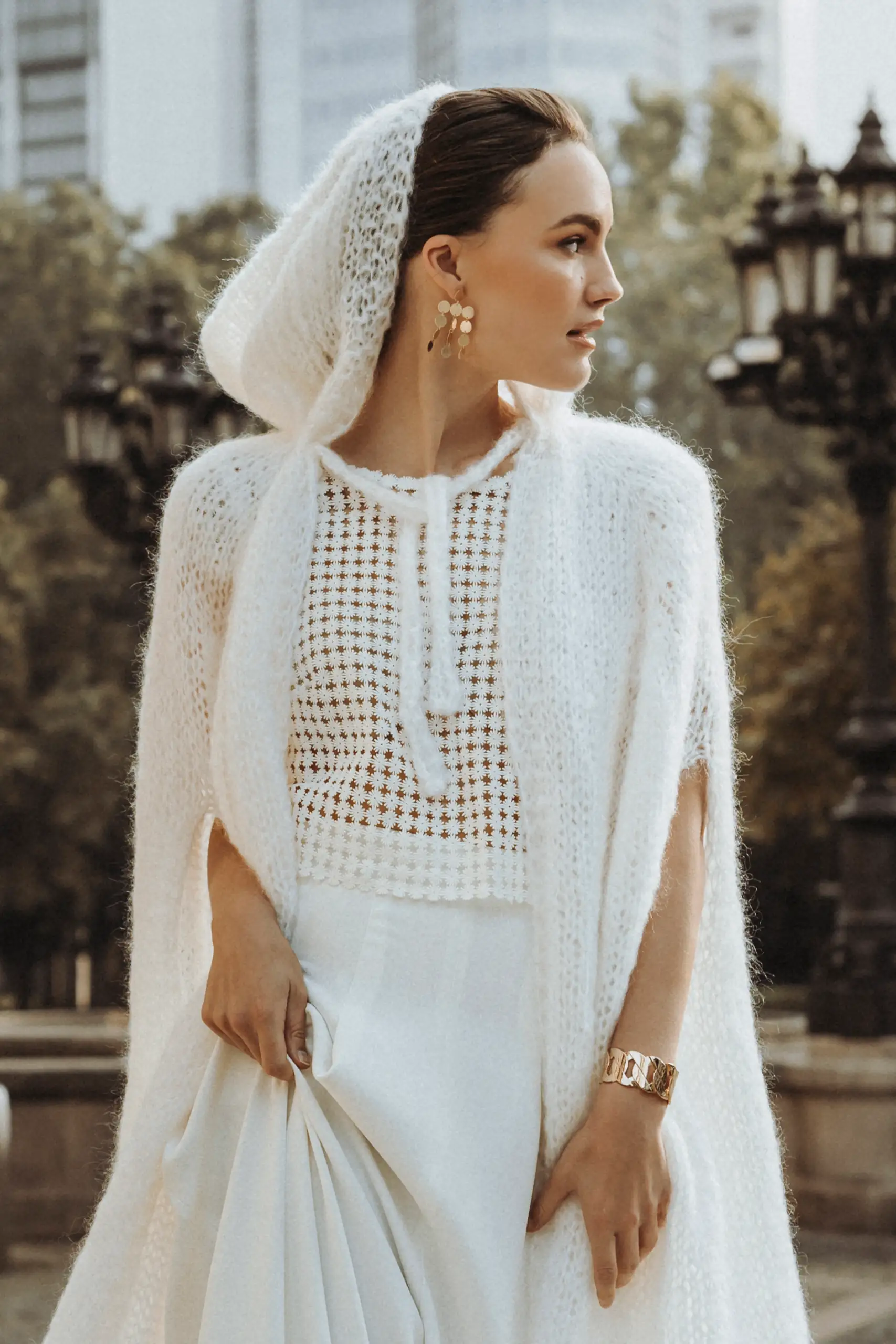 Handgestricktes extralanges Braut-Cape mit großer Kapuze zum Binden, und seitlichen Armschlitzen aus flauschiger Mohair-Wolle-Mischung. Leicht wie eine Feder, cool as hell.
