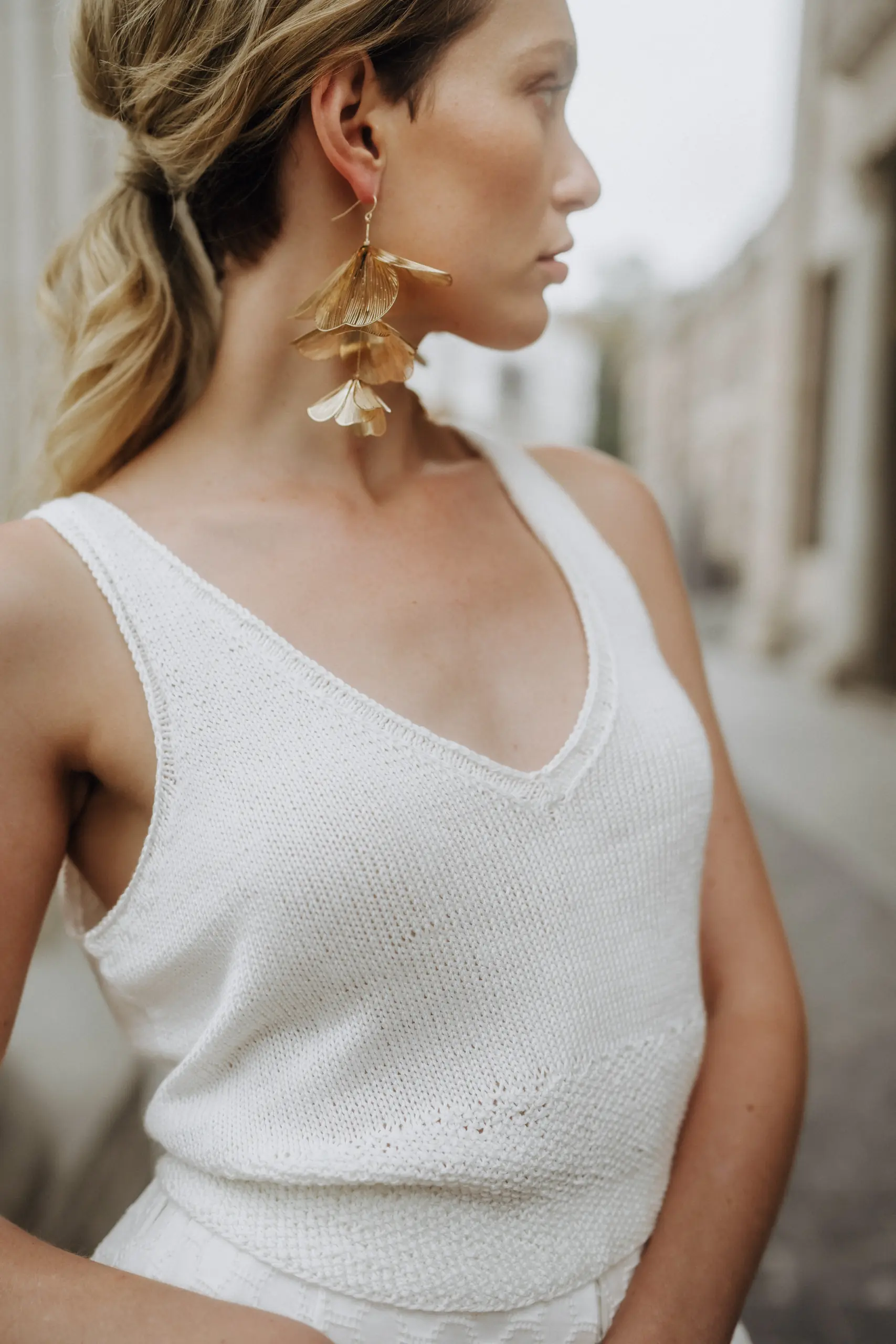 Elegantes, ärmelloses Braut-Top schmalem Trärger und V-Ausschnitt vorne UND hinten, aus exklusivem Bambus-Garn. In feinem Glattstrick im Hauptteil, und Perlmuster im Bündchen, ca. taillenlang. Perfekt zu Hosen und Röcken.