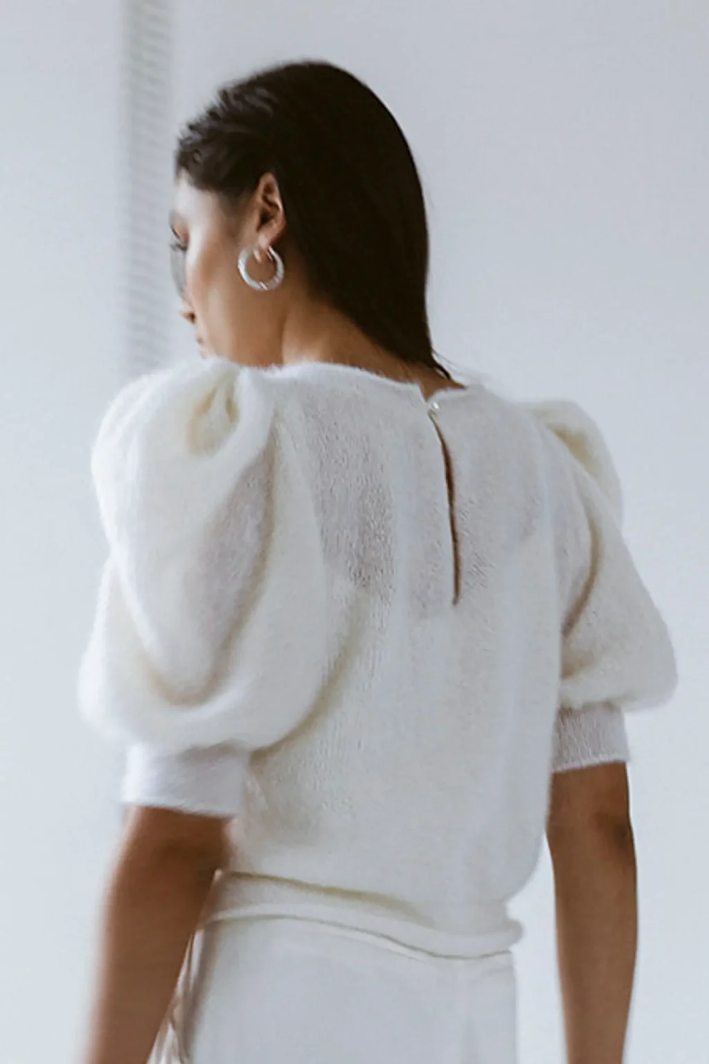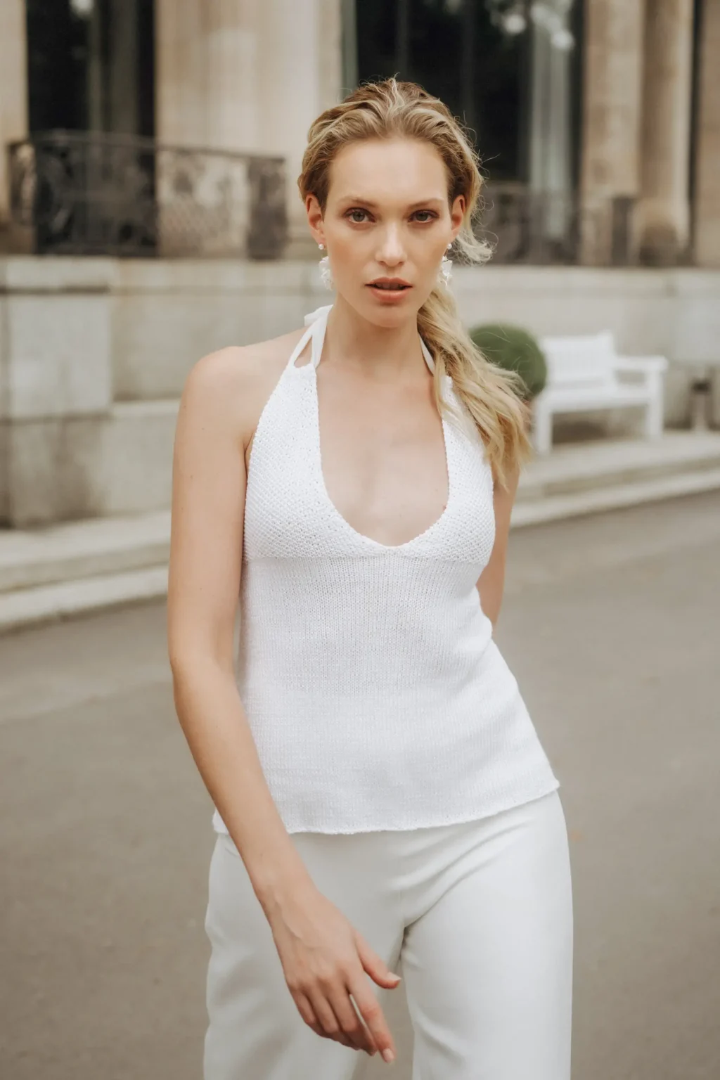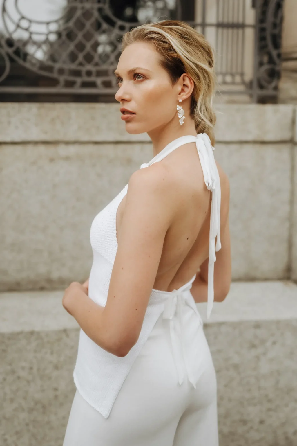 Rückenfreies Braut-Top mit breiten Schleifen in Nacken und Taille aus Chiffon und tiefem V-Ausschnitt vorne. Perlmuster im Hauptteil, Bustier in Glattstrick ca. hüftlang.